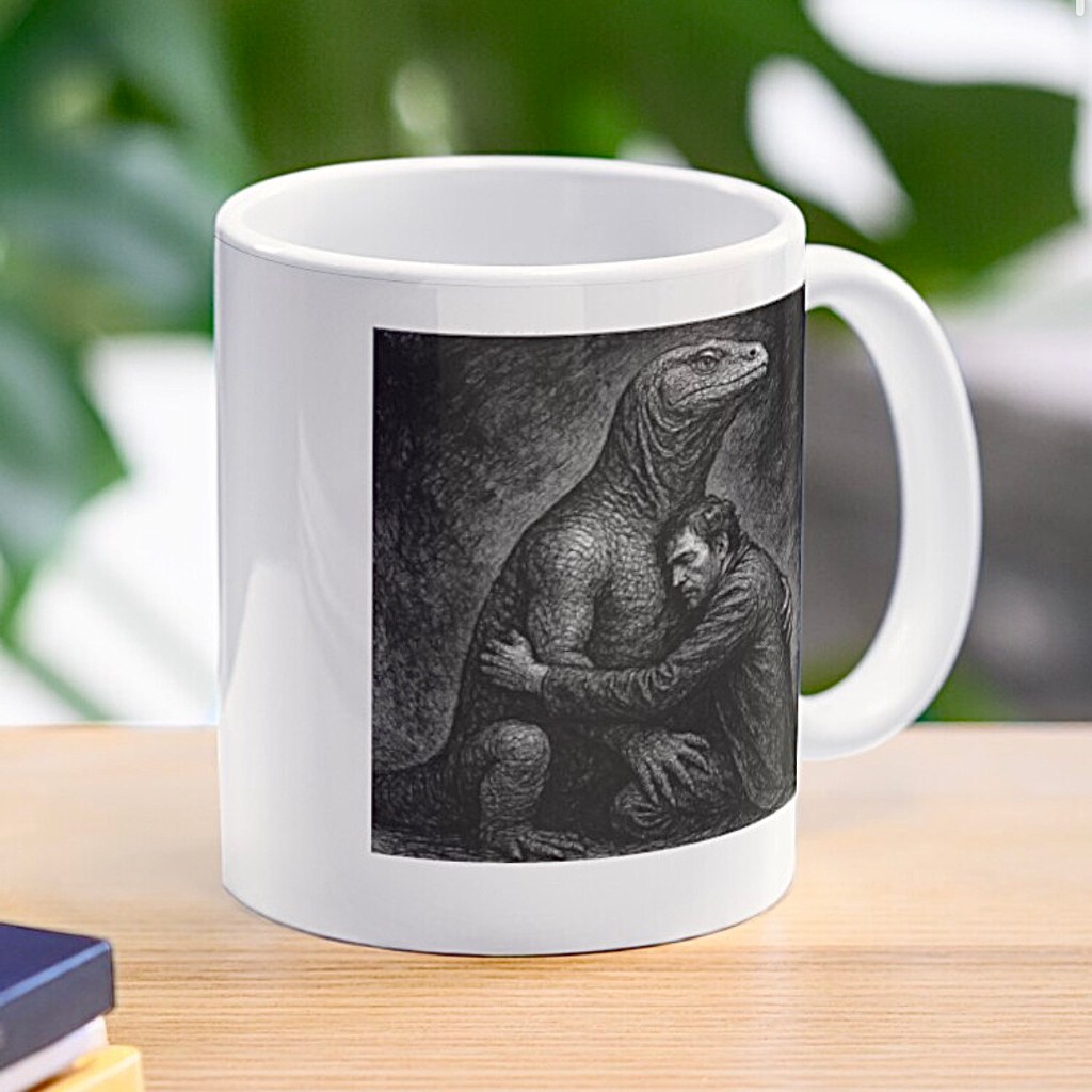 Which brings me to my latest dream journal artwork mug: Free Hugs — where I’ve befriended a Komodo dragon. Yes, a real life dragon. The kind of creature that could absolutely ruin your day… and yet in my dream world, we’re just there, hugging it out like two old war buddies who’ve seen some stuff.