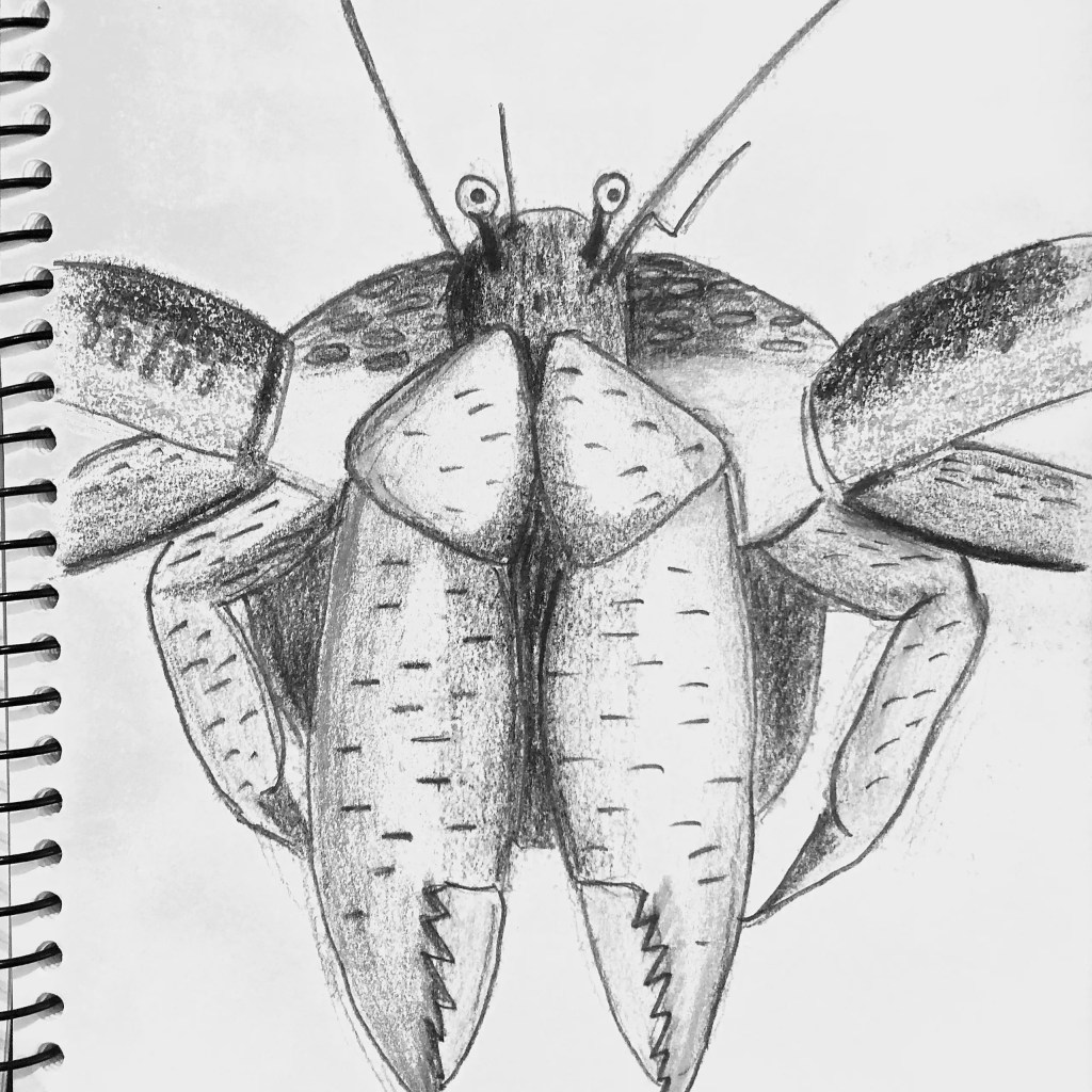My pencil sketch of the coconut crab from Uncommon Animals of the Alphabet started like all my sketches do. It began with enthusiasm and a vague idea. Then, inevitably, there comes a moment when it feels like everything’s gone completely off the rails. Sketching in pencil is a roller-coaster for me. It goes through stages of chaos where the lines don’t quite make sense. It feels like it’s going to end up in the bin. But then, something shifts. I focus on one detail, maybe the curve of a claw or the texture of a shell. I start working outward from there. The sketch slowly starts improving. The chaos diminishes. I finish with something I’m pleased to take into the digital stage. It’s messy, it’s unpredictable, but it’s also where the magic happens—turning a jumble of lines into something that feels alive.