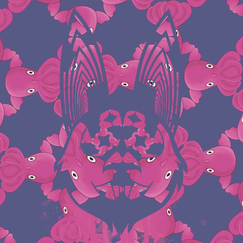 Escher’s influence is equally present, particularly in the way he used patterns and illusions to make viewers question what they were seeing. I’ve always loved the interplay of shapes and how his work demands a second, closer look. That’s exactly what I aim for with the Hypno Bat. It’s often hidden within the larger composition, like in this piece with the Dumbo Octopuses. At first glance, it’s just a vibrant wallpaper, but look closer and the Hypno Bat reveals itself. I want my work to play with perception, to be both a puzzle and a discovery.