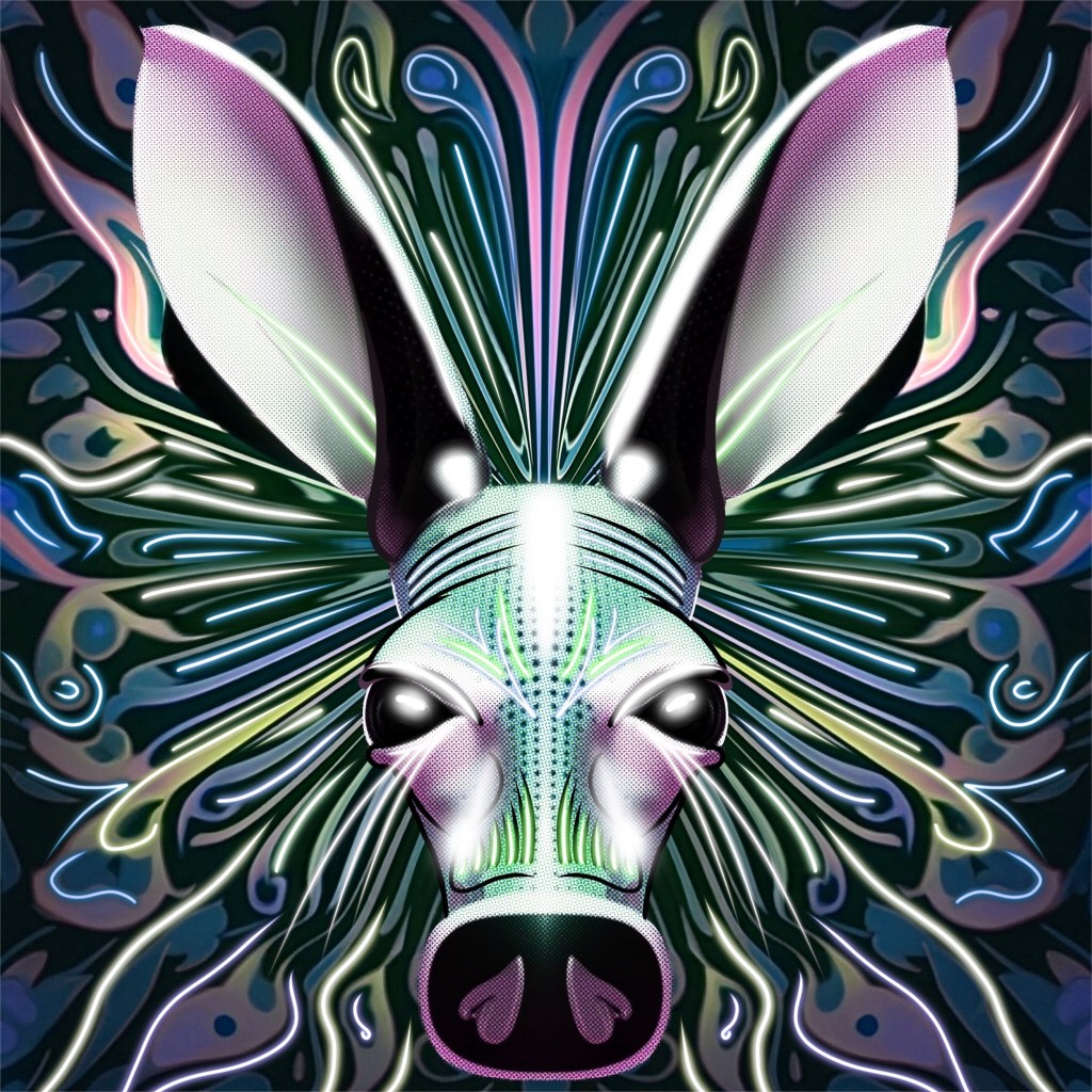 This artwork, Alien Aardvark, is my vision of what happens when we finally see these creatures in a new light—one that elevates them beyond mere earthly existence. Glowing with cosmic energy, this interstellar aardvark embodies the reverence and fascination we would grant to a visitor from another world. Its intricate, luminescent details mirror both its mystique and the interconnected patterns of life, whether on Earth or beyond.
