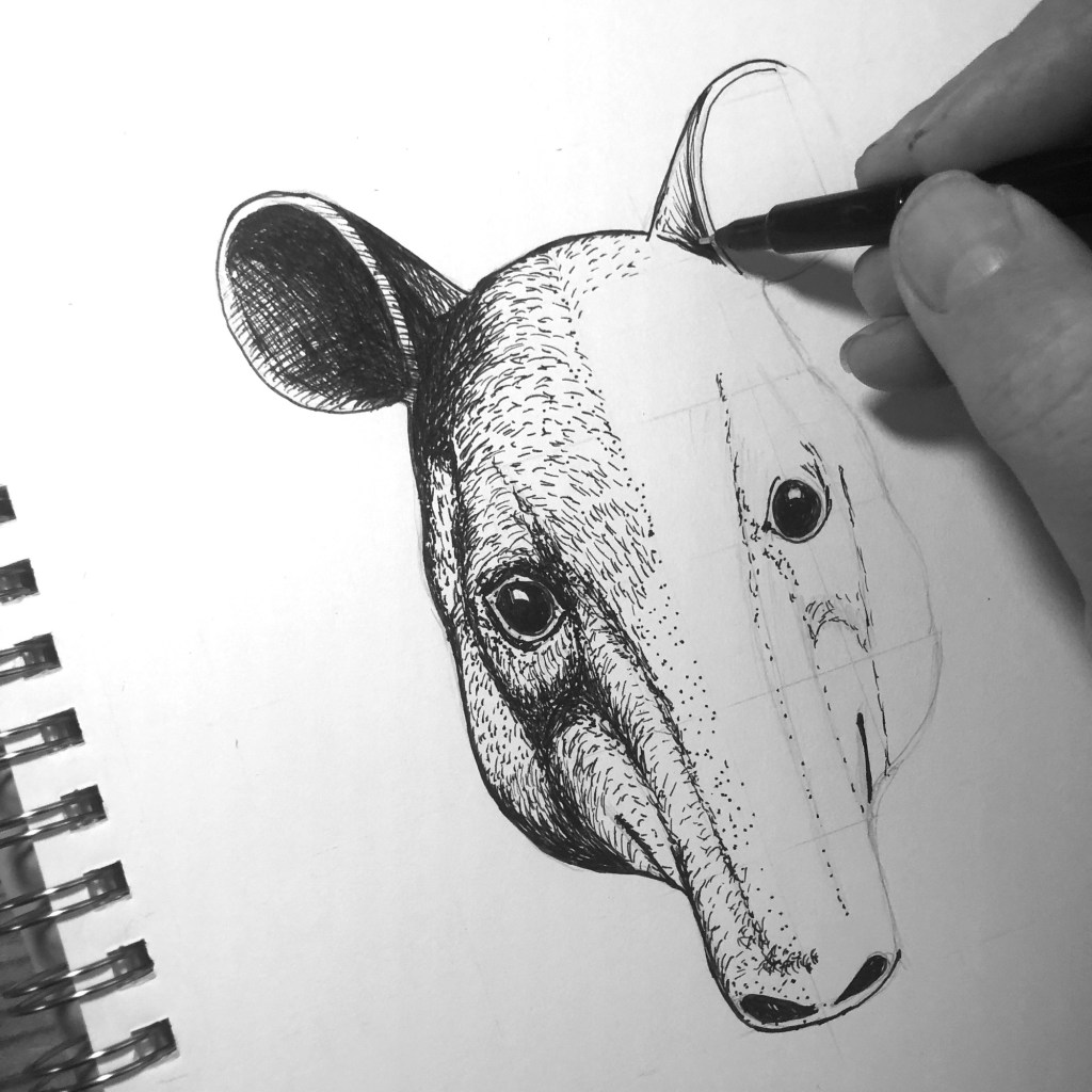 This tapir illustration came from my Uncommon Animals of the Alphabet take on the #Inktober prompt “trunk.” Yes, elephants are the obvious choice, and I adore them, especially after seeing baby ones swim like wrinkly little submarines of joy. However i wanted this prompt to be all about the Uncommon Animals of the Alphabet. No offence, elephants. You’re flawless. I just needed something more, well… Uncommon.